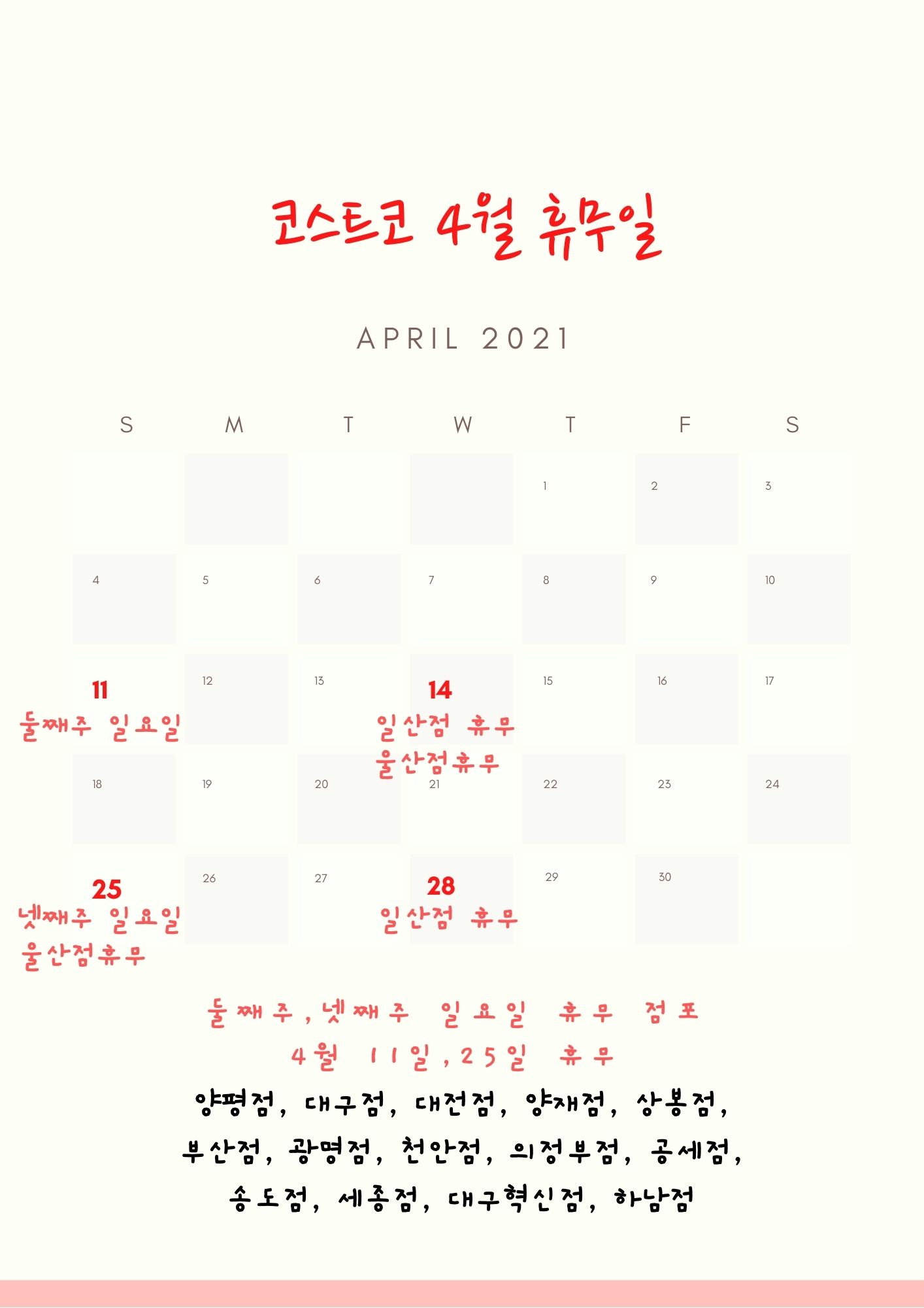 넷째주 일요일, 4월 25일 휴무인 코스트코 매장