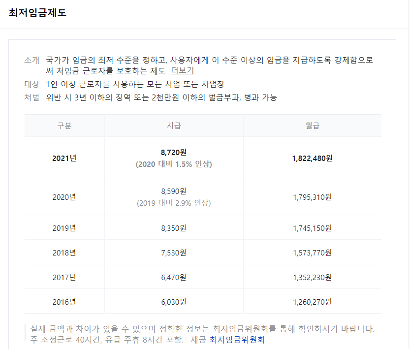 2021년 최저임금은 8,720원으로 2020년대비 1.5%인상 되었습니다.