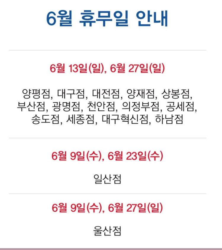6월 27일 일요일 - 넷째주 일요일에 휴점합니다.