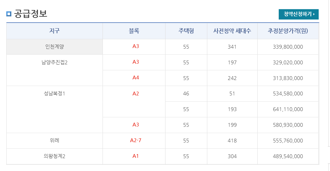 - 의왕청계2 : 경기도 의왕시 청계동, 포일동 일원 480호 중 사전청약 공급호수(공공분양) 304호