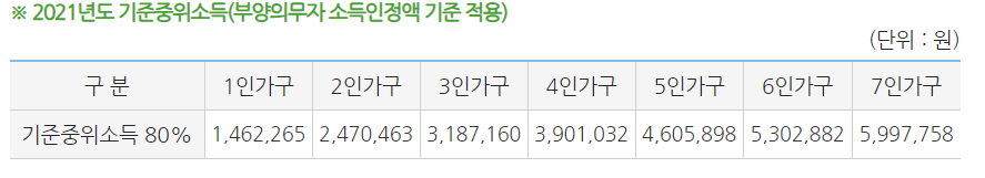 4. 공고일(’21.8.2.) 기준 부양의무자(부모·배우자)의 소득인정액이 기준중위소득 80% 이하