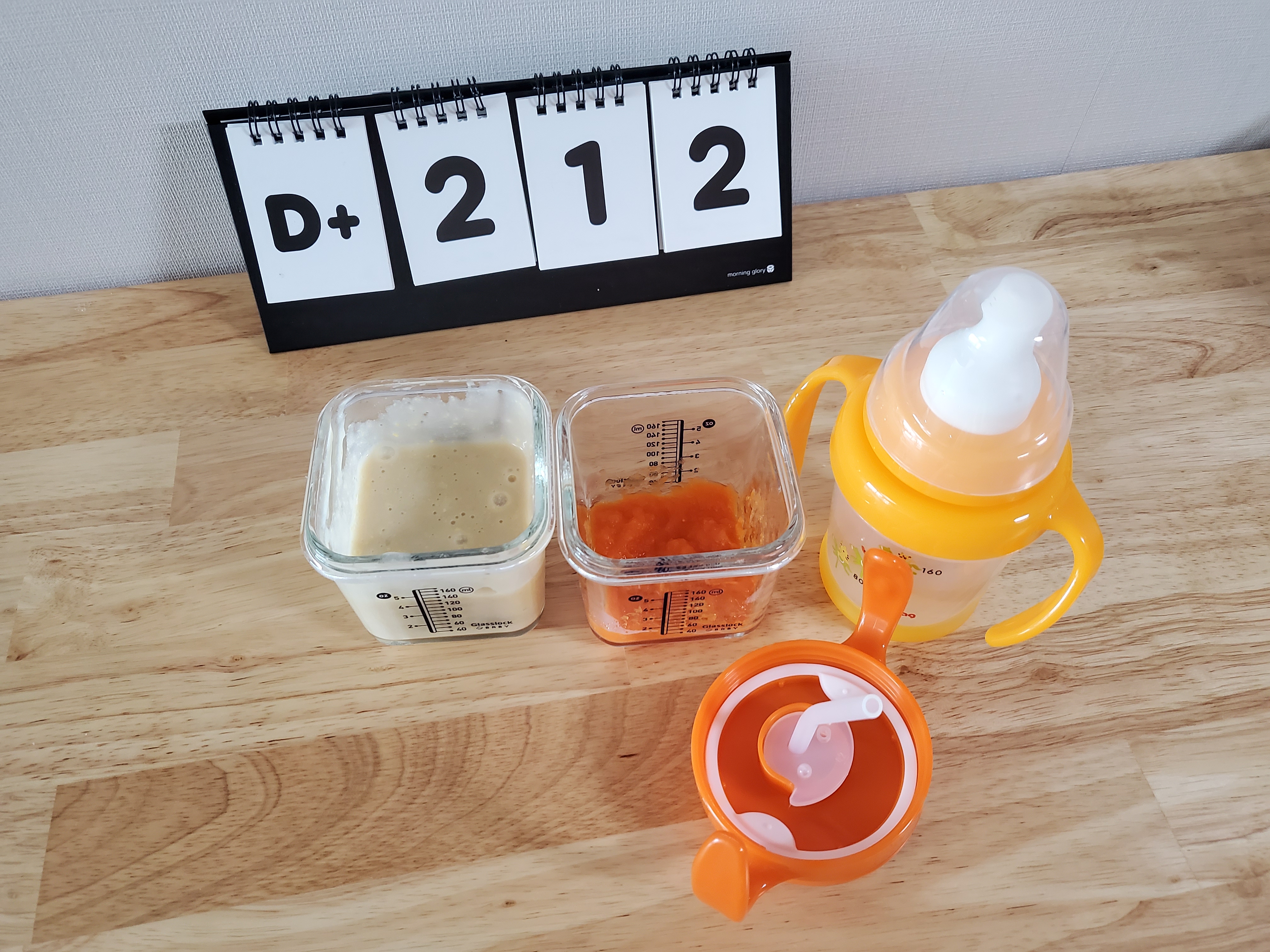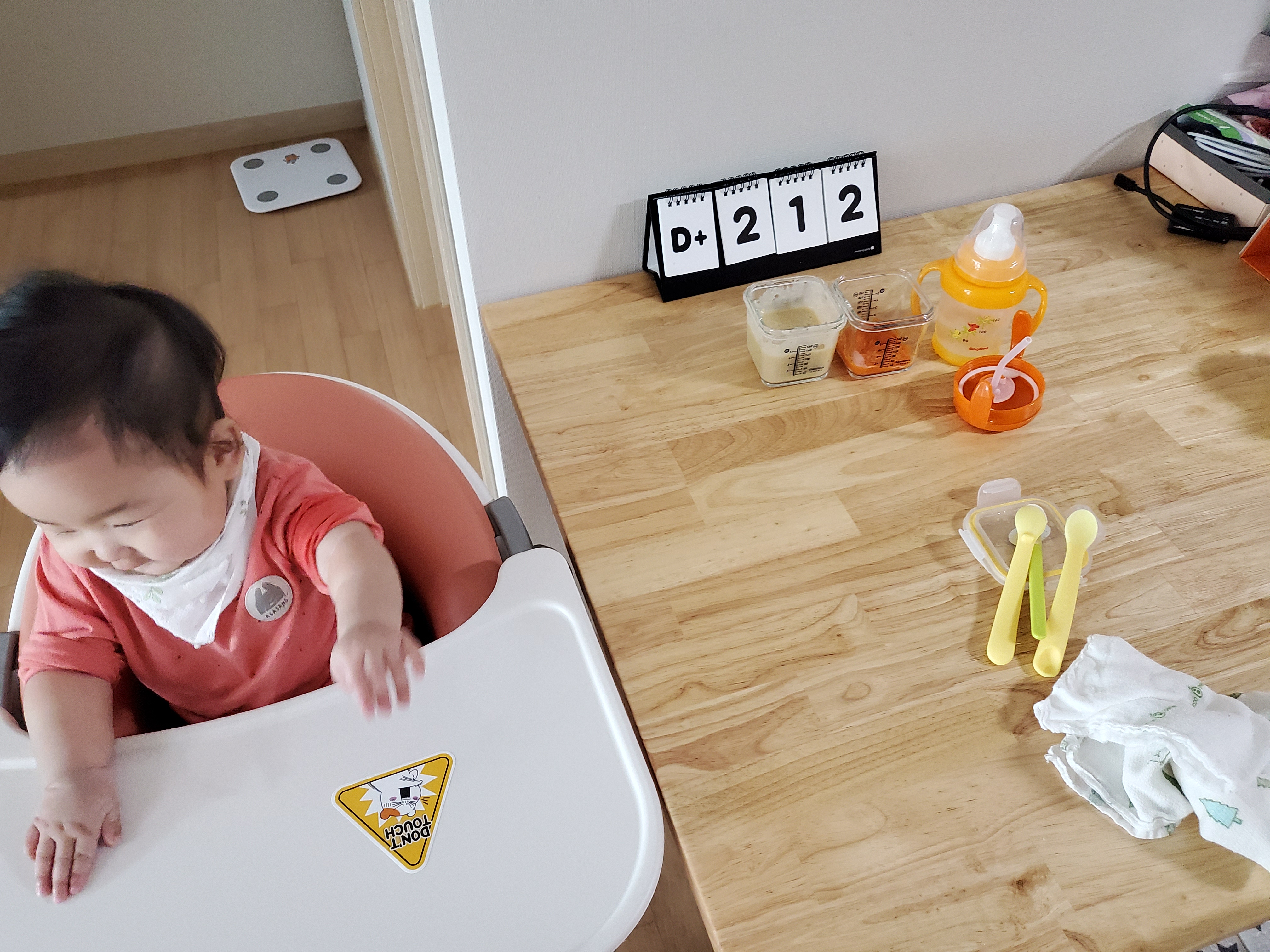 처음먹는 당근 퓨레는 맛을 보더니 찡그린다.