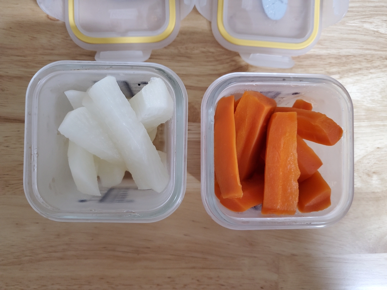 남은 무와 당근은 그릇에 담아서 보관해요.