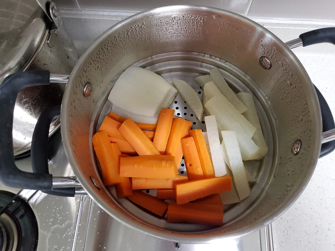 우선 집에 있는 당근이랑 무를 쪄봤어요.