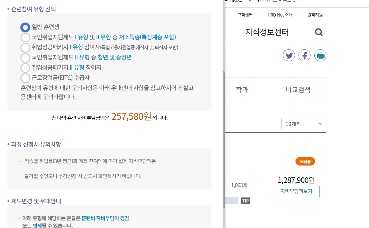 재직자는 일반훈련생으로 1,287,900원의 수강료이지만