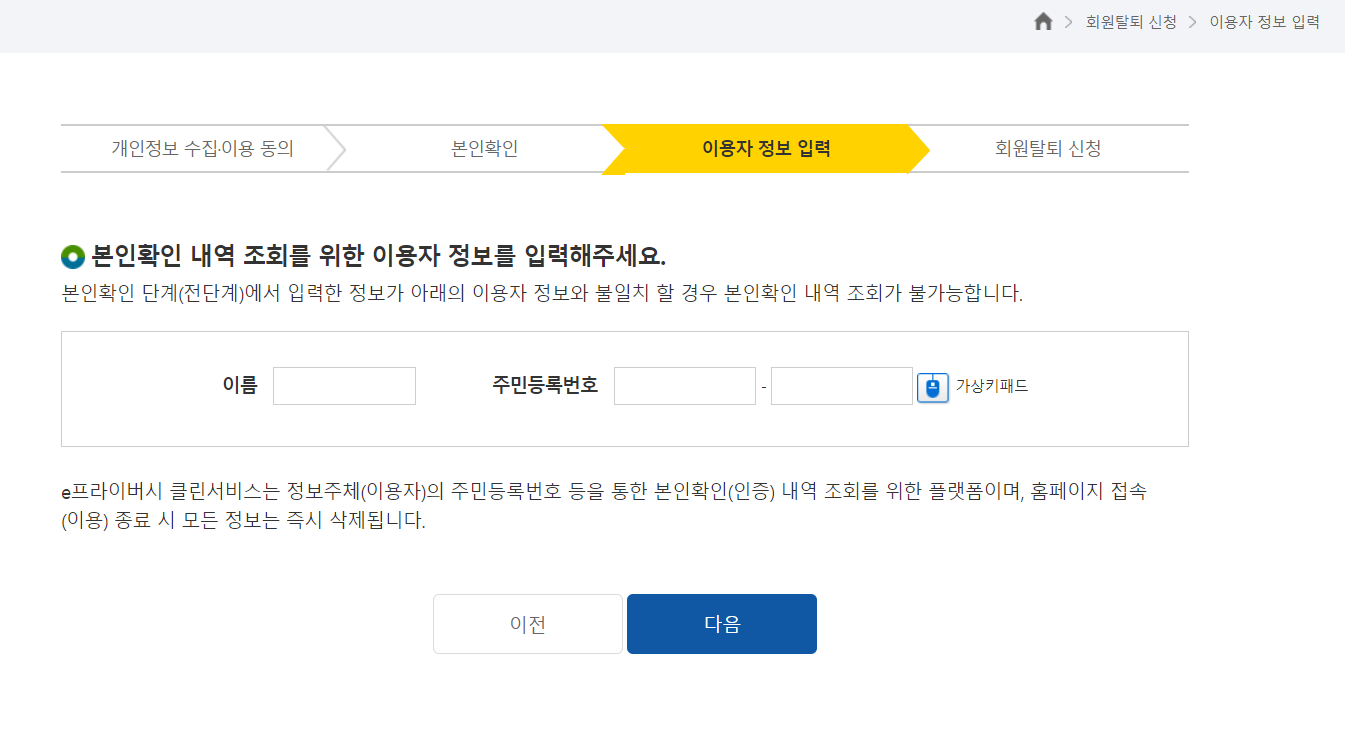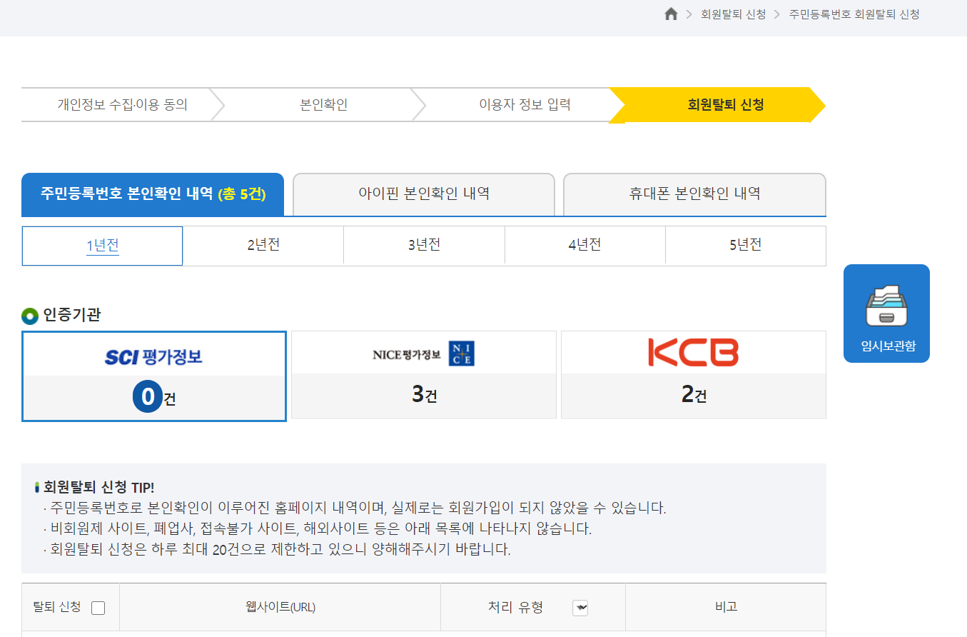 본인확인 내역조회, 회원탈퇴 신청, 회원탈퇴 결과를 볼 수 있어요.