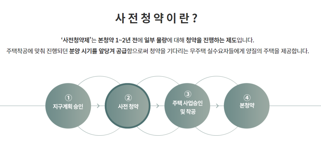 ‘사전청약제’는 본청약 1~2년 전에 일부 물량에 대해 청약을 진행하는 제도입니다.