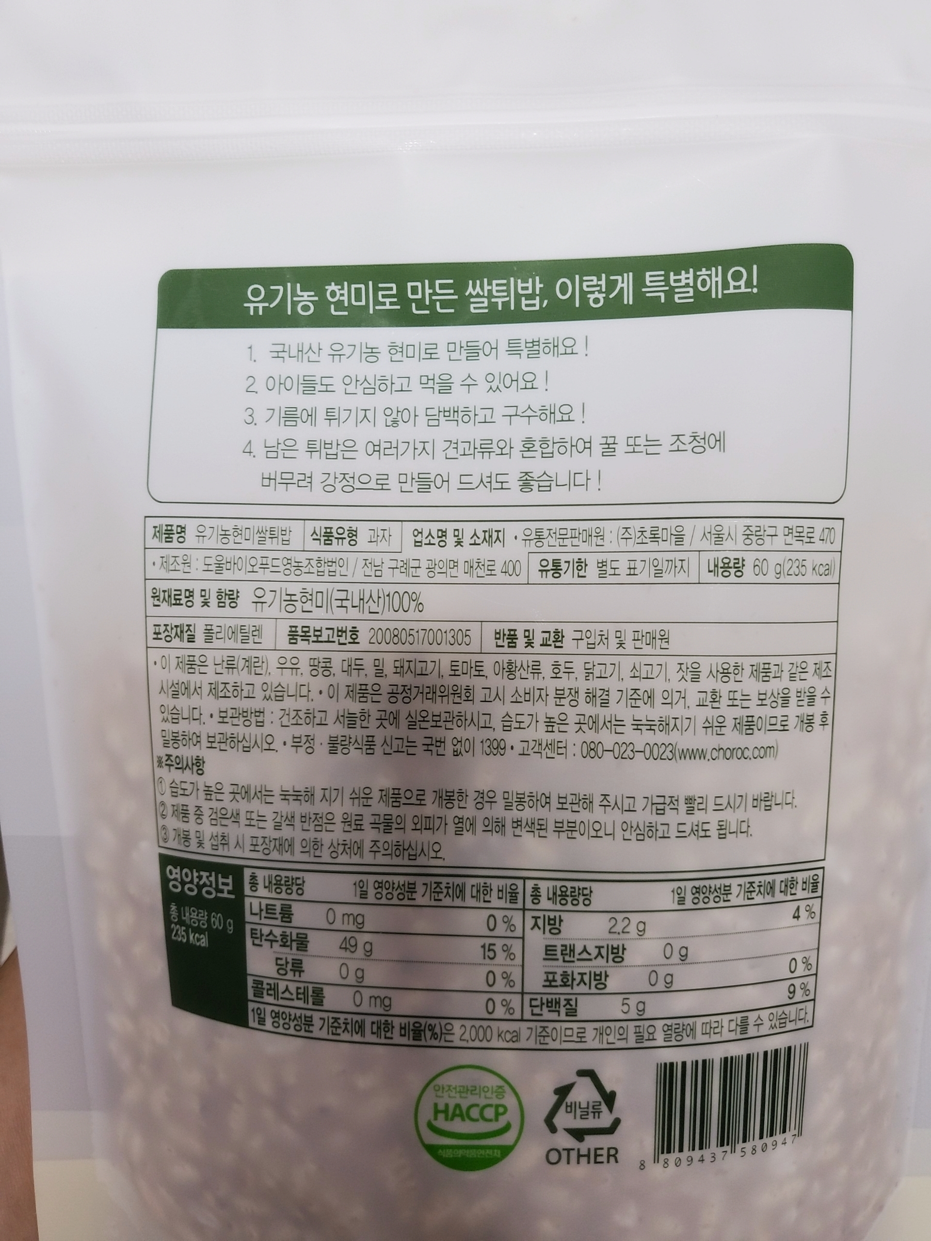 유기농 현미쌀튀밥과 유기농 쌀과자를 구매했어요.