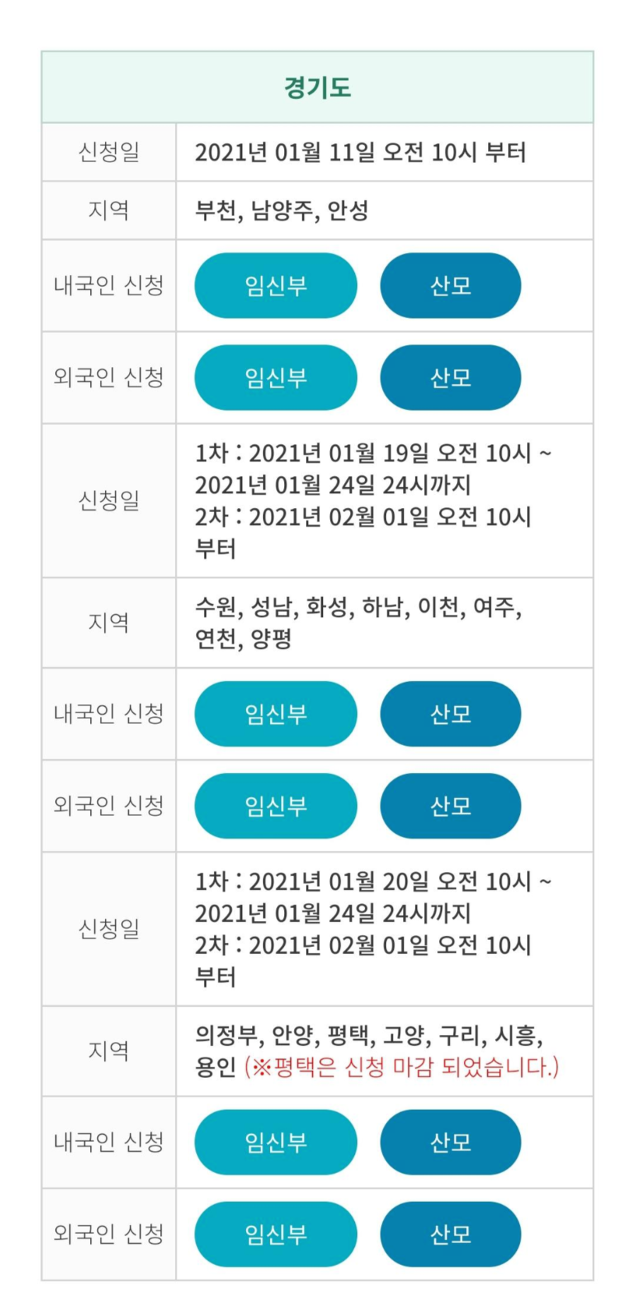 경기도는 지역마다 신청 일자가 다르고